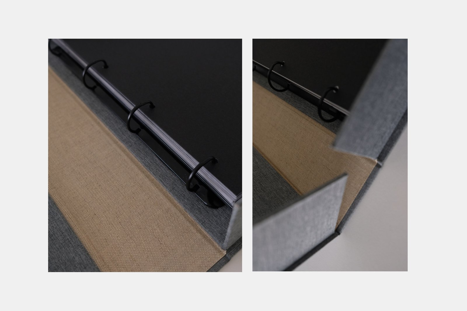 Material – Hand coated Linen on board, 30 punched black fine art Italian sheets sourced from responsibly managed forests, 30 punched acid-free wax papers and a black ash folio binder.