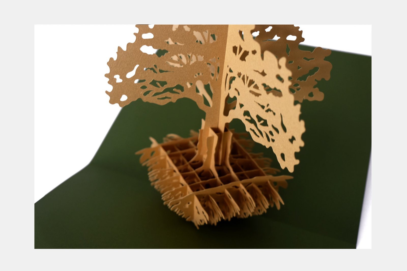 This exquisite handcrafted pop-up card opens into a intricate tree awakening from deep slumber, celebrating life in all its glory. The stunning reveal elicits a gasp of pure delight from even the most discerning viewer.
